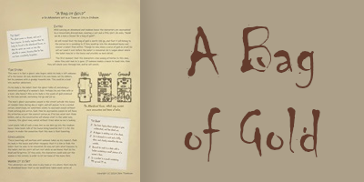 "While passing an abandoned and rundown house the characters are approached by a respectably dressed man, wearing a suit and a frilly shirt. He asks, 'Would you do a man a favour for a bag of gold?'."